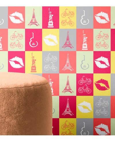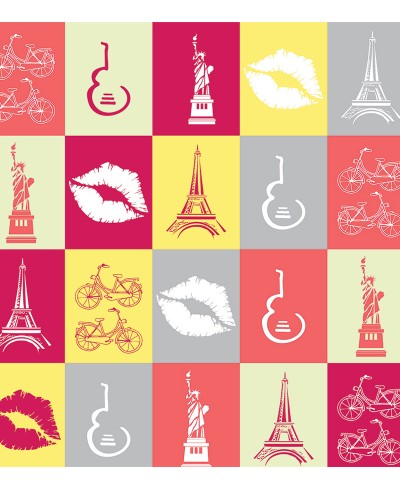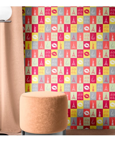 Papel de parede em tons de branco rosa cinza e amarelo no temo de Paris, modelo perfeito montar seu quarto dos sonhos.