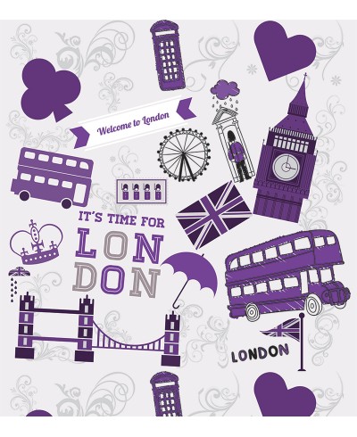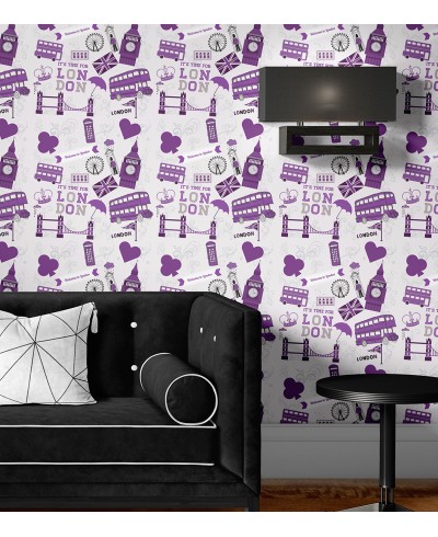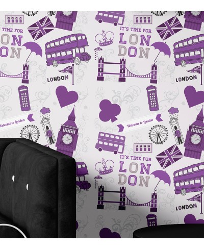 Papel De Parede Sala e Quarto Londres com detalhes em roxo com estampa exclusiva e perfeita para decorar seu lar.