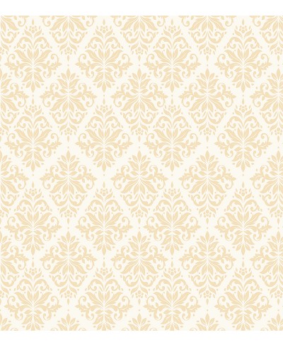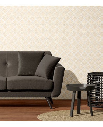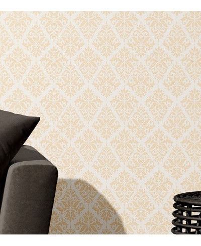 Papel de parede damask em tons de bege com fundo branco, perfeito para decorar sua residência com esse perfeito clássico do arabesco.