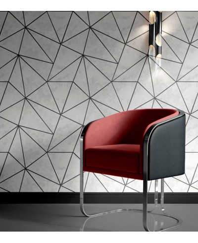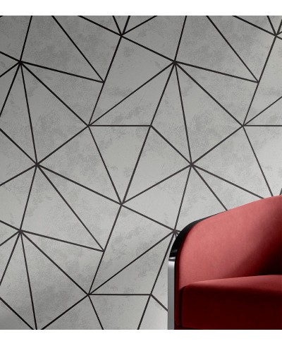 Papel de parede estilo e tendencia neste modelo, aliado ao fundo do papel de parede imitando a textura cimento queimado com o padrão geométrico em traços preto.