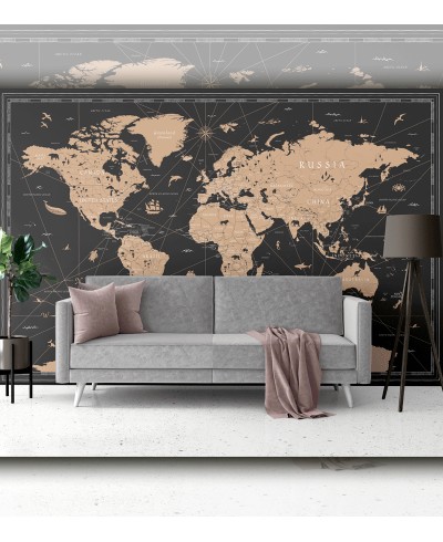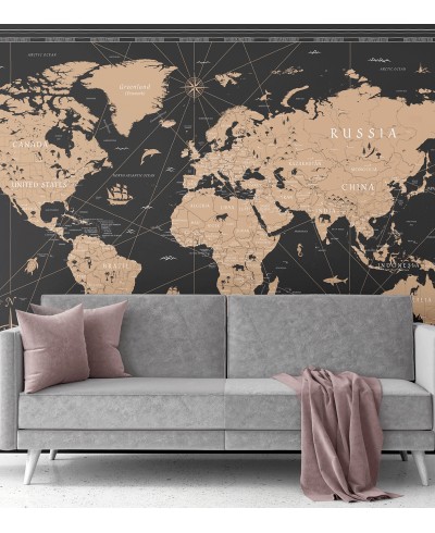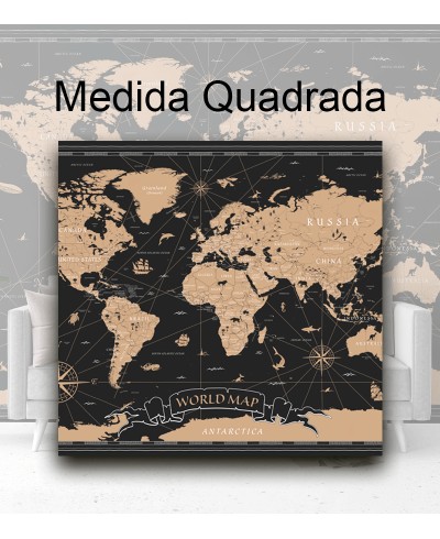 Mapa Mundi Preto Bege Vintage apresenta todos os tipos de criaturas amigáveis e picos iconográficos que certamente irão deixar o seu ambiente ainda mais completo, desenvolvido com muito carinho para você!