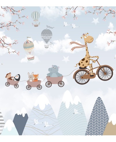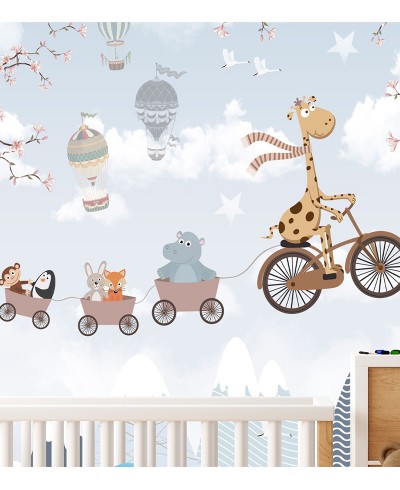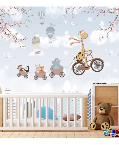 Foto mural infantil Zoo Girafa em bicicleta e balões é um lindo modelo cheio de charme para decorar o quartinho do seu grande amor, aproveite!