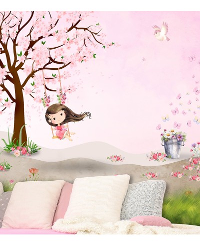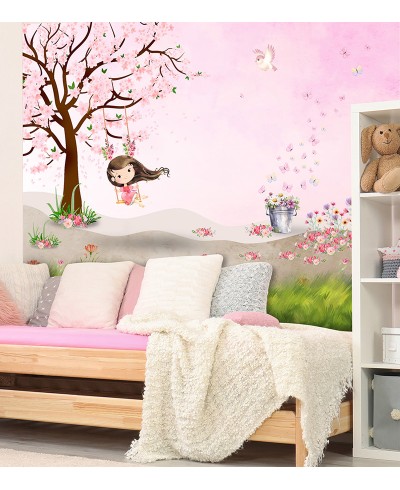 Papel de Parede Foto Mural Infantil Menina em Balanço com Borboletas