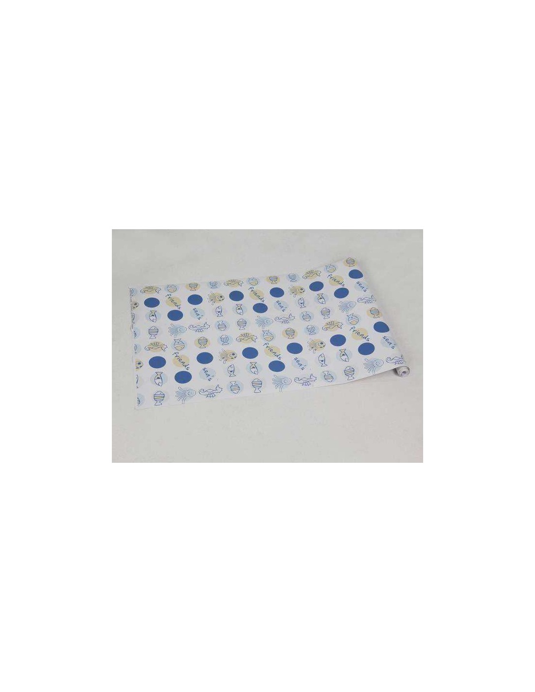 Papel de parede com fundo branco, e detalhes em azul escuro, amarelo, cinza e azul claro. Ótimo para o quarto do seu filho, as crianças adoram!