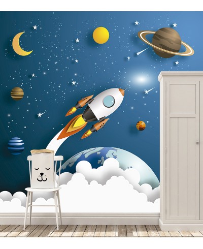 Fotomural Foguete no espaço perfeito pra decoração infantil, é um dos mais adorados entre meninos, levando mais cor, criatividade e alegria ao ambiente.
