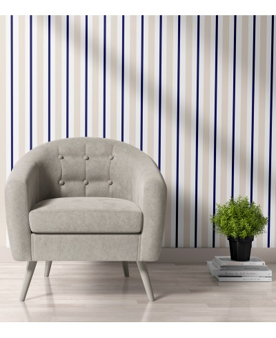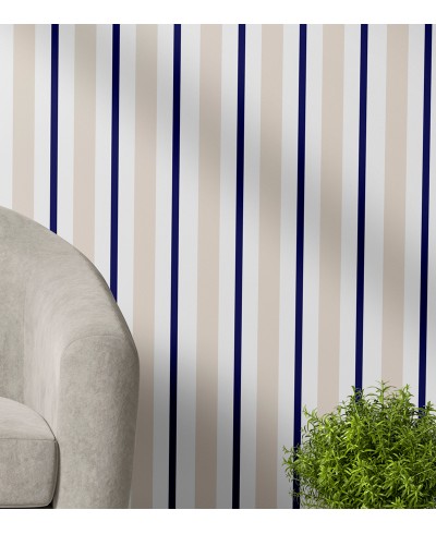 Papel de parede listrado em tons azul, bege e branco trazendo sofisticação ao seu ambiente e leveza, aproveite!!