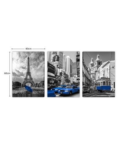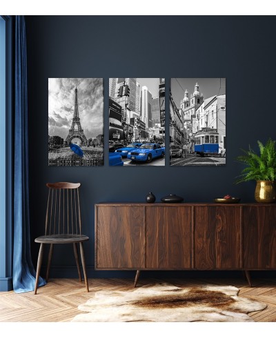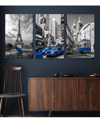 Trio Tela Decorativa Paris, Nova York e o Táxi com destaque em azul, perfeito para decorar e trazer leveza ao ambiente, aproveite!
