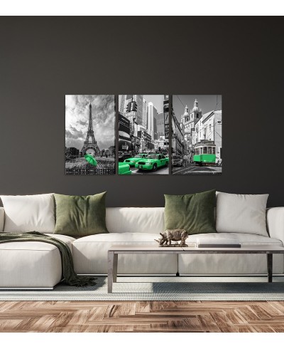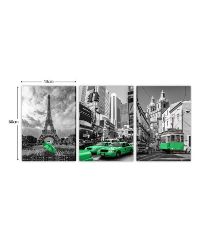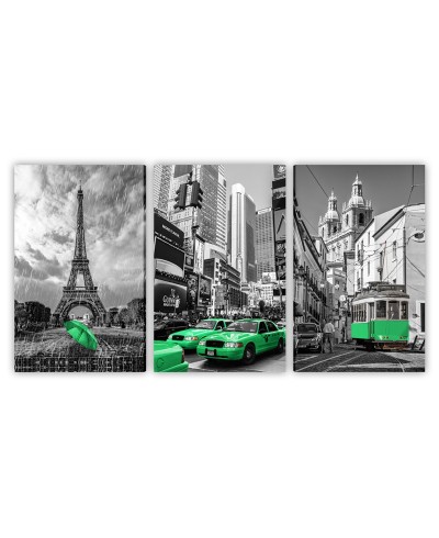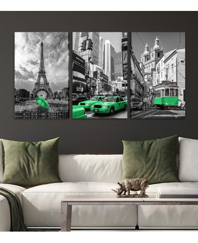 Trio Tela Decorativa Paris, Nova York e o Táxi com destaque em verde ideal para renovar seu ambiente, aproveite!