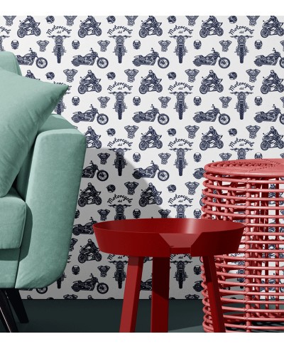 Papel de Parede Temático Motos em fundo branco e pingos de tinta com desenhos em azul escuro