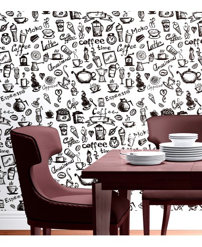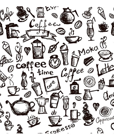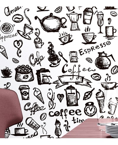 Papel De Parede Gourmet Café com fundo branco e detalhes preto que permitem uma ótima opção para decorar aquele cantinho especial do café.