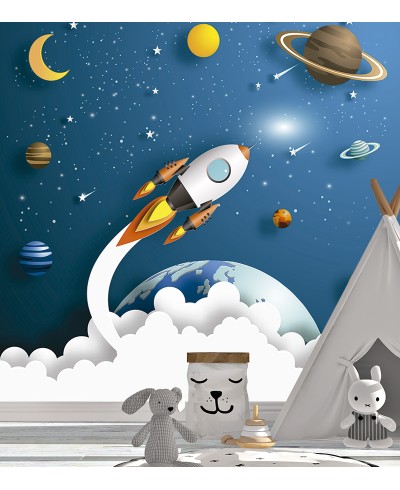 Fotomural Foguete no espaço perfeito pra decoração infantil, é um dos mais adorados entre meninos, levando mais cor, criatividade e alegria ao ambiente.