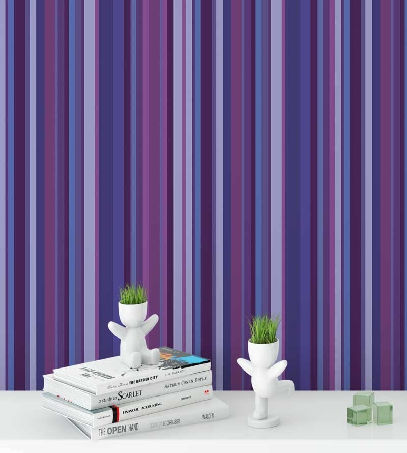 Papel de parede com listras em tons de roxo, azul, e vinho