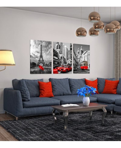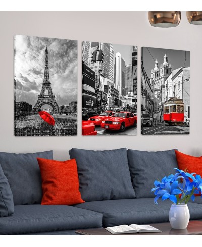 Trio Tela Decorativa Paris, Nova York e o Táxi com destaque em vermelho ideal para transforma seu ambiente com charme e sofisticação, aproveite!