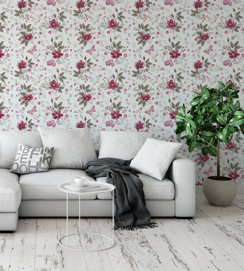 Papel de parede floral com fundo branco e pequenas flores em rosa, roxo e vermelho,...