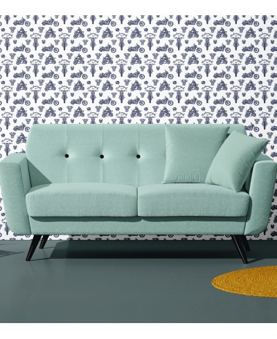 Papel de Parede Temático Motos em fundo branco e pingos de tinta com desenhos em azul escuro