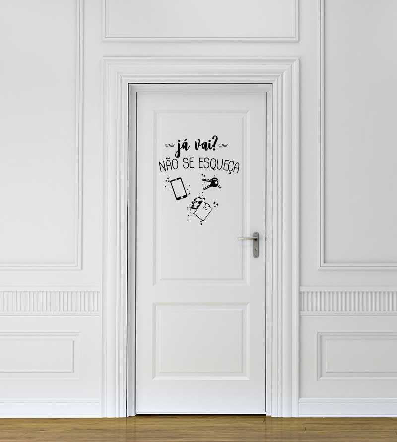 Adesivo de parede com o tema cozinha, possuindo frase: " Já vai? Não se esqueça" um celular,um par de chaves e uma carteira.